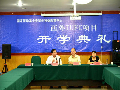 2014年西安外国语大学出国留学人员培训部TUFC留学预备项目于8月28日举行了盛大的开学典礼,西安外国语大学出国留学人员培训部主任赵堪培,教务主任杨丽娟,TUFC招生主任安光明以及国家留学基金委东方国际教育交流中心主任张靖共同出席了此次开学典礼。